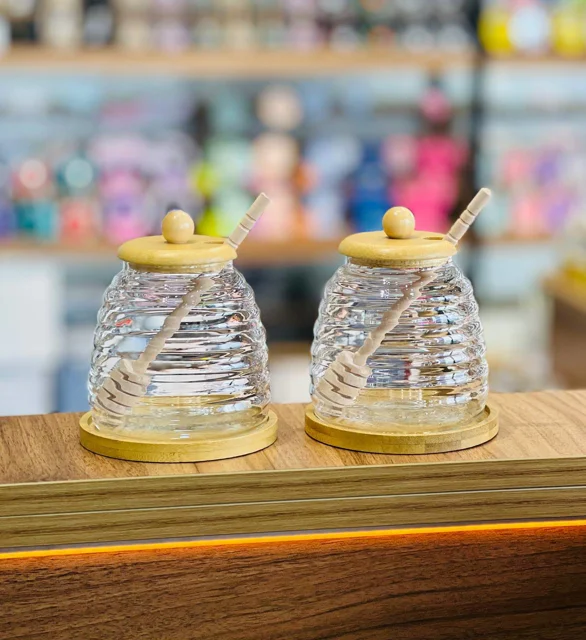 عسل خوری ( ظرف عسل ) ، درب بامبو ، زیره بامبو قابل شستشو ، قاشق چوبی با کیفیت ، وارداتی 🇨🇳جنس بدنه پیرکس ، ارتفاع محصول ۱۳ سانت ،