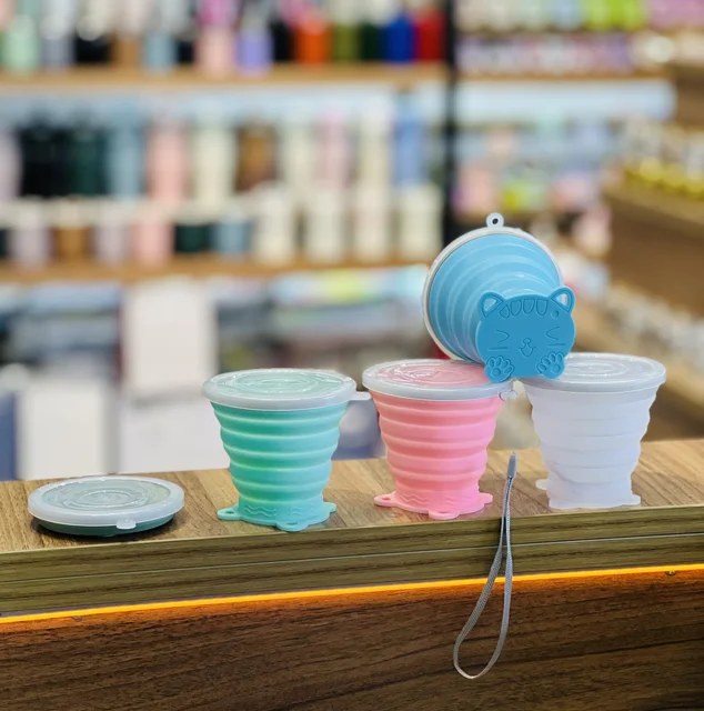 لیوان تاشو سلیکونی ، لبه استیل جهت کیپ شدن درب ، وارداتی ، ۱۰۰٪ سیلیکون ، بند دار ، اندازه خیلی کوچک جهت استفاده در کیف ،