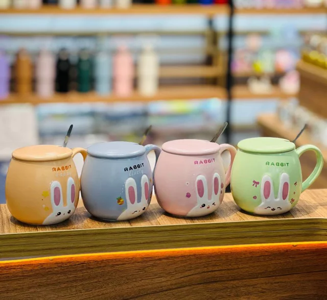 ماگ خرگوش سرامیکی ، درب دار ، قاشق استیل ، وارداتی 🇨🇳 با کیفیت بالا ، قابل استفاده روزمره برای نوشیدنی داغ و سرد ،